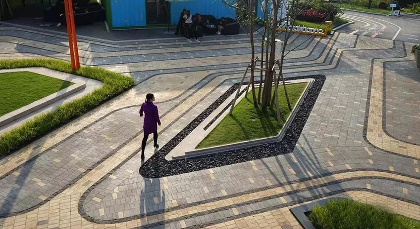 在景观铺装中,用色彩替代了暗黑色沥青,结合了混凝土的强度与沥青的灵活性,形成有视觉吸引力和耐用的路面,这种装饰铺装系统可以复制在任何设计中的大范围色彩,充满了趣味与张力。